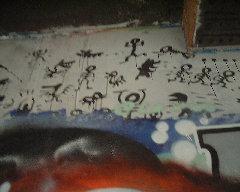 かつて、全壁面に奇怪な原始的なような 宇宙との文明交流を創造させるような 落書きが突如現れて新聞等で話題になった のをご記憶の方も多いと思います。 その絵にチョット近いものを感じてスナップ しました。 |