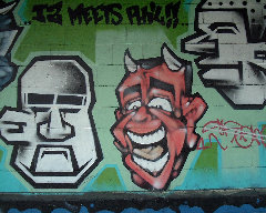 | 桜木町JR高架下の落書で、目に留まったものをスナップしてみました。 やっとの8作品です。近年、アルファベットのみの落書きが増殖し、寂しい限りです。 人物、キャラクタの書かれたものはこの他にもありますが、毒どくしいものが殆どで すねぇ。歩いてる人が立ち止まってしまうような魅力的な落書きを期待しています。 落書き作者のみなさん、お願いします。 |