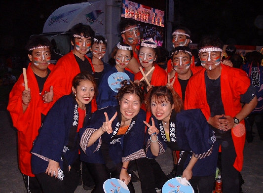 | ハマこい参加の各団体は、同じイベントに参加しているという仲間意識が自然と生まれます。 素晴らしい炎舞は、ライバルであることも忘れて本気で応援してしまします。 「横浜創英高校Band & Dance」(グランプリ受賞) 初日のスカイビル・そごう2階デッキでの炎舞を見たとき既に、優勝有力候補だと感じました。自校ブラバンのサイドステップしながらの演奏をバックにしての豊富なフォーメーション展開の美しさ、100名が一体となった炎舞に何度も感動してしまいました。 一見すると普通のハッピなのですがターンが映える工夫のされた衣装デザインにも、創英さんの木目細かな完成度とスタッフの優秀さが窺い知れます。 「高校白書2000」(サッポロビール飲料賞受賞) 炎舞スケジュールが、近かったので炎舞前後の時間に一緒に何度の盛り上らせていただきました。楽しかったですよ。いくら鍛えているとはいえ若さで負ける我々は、そのあと疲れが出てしまう時も・・・。 AHH(・^^) 上はTシャツ下は制服と放課後の仲間同士で盛り上ってるようなスタイル。BGMは、パーカッション音のみとシンプル、本場高知から取り寄せた鳴子を 使ってのダンスは、高知の鳴子を全く無視(?)してのお遊戯ぽい感じのカワイイ踊り、我々マックス横浜の中からは、「かわいい!楽しそう、一緒にあの中に入って踊りた〜ぃ」との声が良く聞こえてきました。+私も言ってました。(・^^;) リーダーカッコ良かったよ! 特に単身、地方車(じかたしゃ)に乗ってる姿。 |