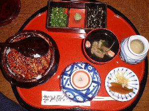 名古屋名物”ひつまぶし”を商標登録している「蓬莱陣屋」(熱田、創業130年)の系列店、「あつた蓬莱軒」(栄、松坂屋店)で食べてきました。 鰻の蒲焼きとご飯をまぜ、食べ方を変えて三膳を楽しむ料理です。 |