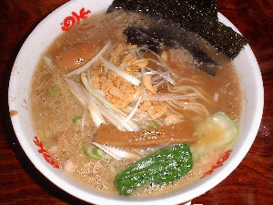 )きっと外まで並んでるときは、1時間半くらいお預けを食うのでしょうねぇ。 メニュウは、こってりラーメン、あっさりラーメン、鉄鍋みそラーメンの3種類にトッピングを選べるようになっています。私が選んだのは、こってりラーメンの全部のせ。トッピングの質にも拘ってるようです。 |