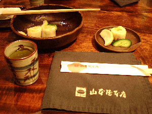 味噌煮込うどんを注文すると、直ぐにお茶と漬物が出てきます。主役登場までの期待の一時、名脇役となってます。 右下の布は、前掛けです。うどんを食べるときの露が、服に付かないように用意されてます。皆さん使ってました。 |