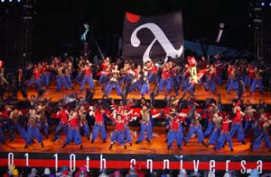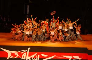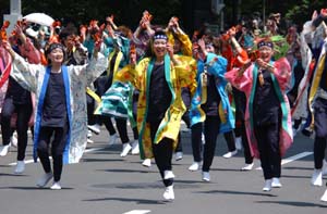 | 祭りの規模日本一! 毎年6月7〜10日までに行われる「よさこいソーラン」。今年で10回目を迎えるこの祭りに、Hiro、行ってまいりました!この祭りは年々規模が大きくなり、今年は参加408チーム、踊り手が4万人にもなり、今や本場・高知のソーラン踊りはおろか、青森のねぶた祭りをもしのぐ日本一のお祭りになったそうです。確かに札幌市内32会場いたるところで行われていて大通り公園などははっぴを着た人、人、人!新聞も特別紙面を作り、テレビも特番で5時間ぶっ続けで放送。北海道ウォーカーでも別冊特集を発行などなど。。。関東ではあまり知られていないよさこいも、ここ北海道での熱気はスゴイのひとこと。まさに街をあげてこの祭りに協力している姿勢が随所に見られました。 |