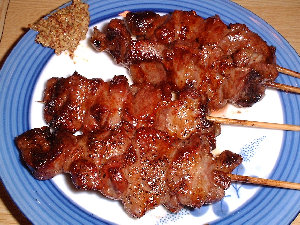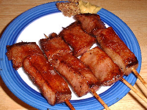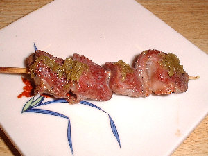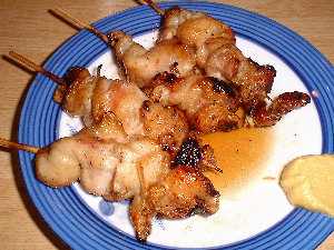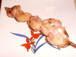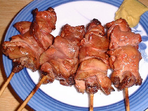 | 鶏皮、もっとも美味しいところのみ串に刺していますので、一串に三羽、4本合計で12羽の鶏を使っています。 |