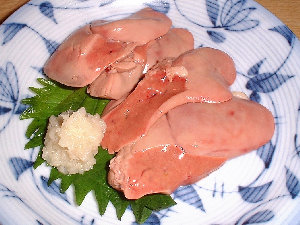 鶏ホアグラのお刺身、身の締まった繊細な味のする鮟肝といった味がします。 |