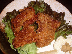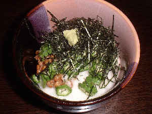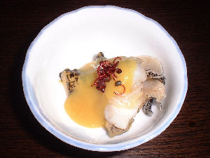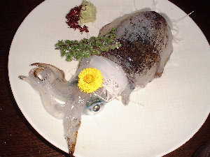 透明なイカ刺の上に、皮が乗せてあります綺麗な盛りつけです。身を肴に楽しんだあと皮とゲソをみんなで楽しむ為に、カットをお願いしたのですが、帰らぬお肴となってしまいました。 折角のお肴、寂しぃ〜 (・;_;) 宴会が、入っていたようなので、忙しくて我々のお願いまでは、気が回らなかったのかな? 次回は、お願いします。 |