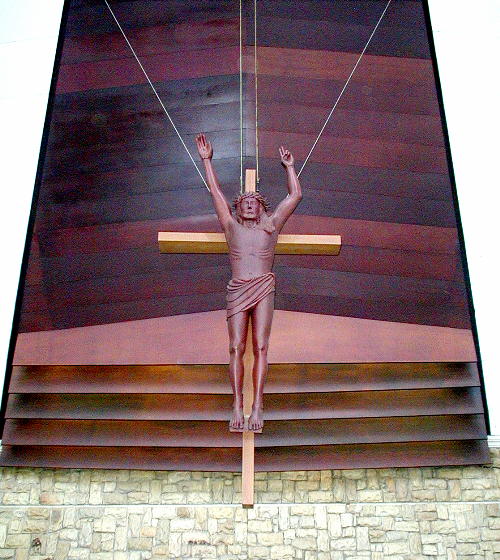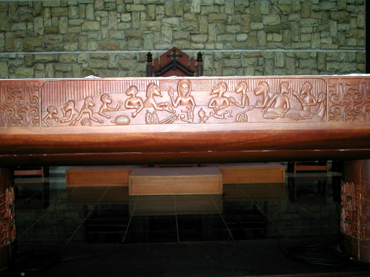 西洋的ではなく、パプアの伝統的な彫刻です。この部分は、祭壇の中央部で、会衆の