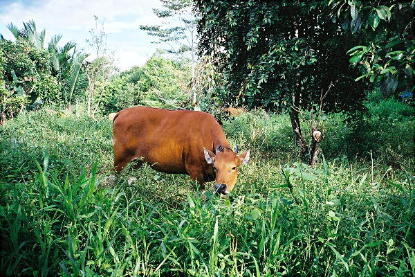 学校の校庭、道路沿いの草むら、家のまわり、どこにでもいる牛。茶色い毛いろの牛です。肉