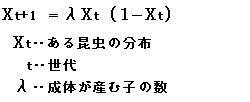 ロバート.メイという生態学者は生物の個体数を予測するモデルを次のようなロジステイック方程式を用いて数値実験をおこないました。実験の結果、その関数のなかのある係数が一定の価を超えると個体数の動きのパターンは 周期性を失って予測不能になっていくことを発見しました。