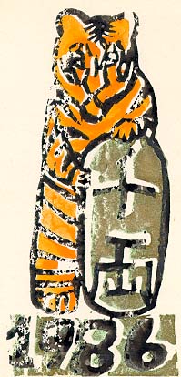 亥年です。なんとか猪に見えますよね。刷った状態の物が手元に1枚しか無かったのでこれを取り込んだのですが、これは刷りに失敗してるヤツですね。刷っているときに版木と紙が動いてしまい、絵の具が擦れたのでしょう。