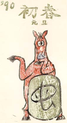 午年です。小判(馬が実物大だったらとても「小判」と呼べる大きさではありませんが、小さい置物の「招き馬」という設定ですので)の中は、前年に亡くなった手塚治虫先生に敬意を表して「虫」マークです。