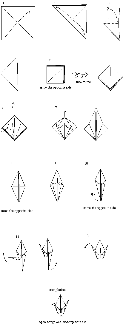 Following is showing how to make a crane .It is rather a difficult one but it is interesting. First, you have to prepare a squre piece of paper (origami paper). Some japanese people make a thousand cranes and send them to one who is seriously sick in hospital.Sending them is like an incantation good for recovery. If you don't mind, please send us your comments by e-mail. Your :name Your e-mail address: Comments: If YOU WANT TO MAKE VARIOUS KINDS OF ORIGAMIS, WE OFFER YOU TO GET A COPY OF "HOW TO MAKE ORIGAMI" THAT EXPLAINS YOU HOW TO MAKE THEM WITH A SPECIAL PACK OF ORIGAMI PAPERS. AFTER GETTING E-MAIL AND U.S.10$/each BY MAIL FROM YOU, WE WILL SEND THEM TO YOU. Would you like us to send you a copy of"HOW TO MAKE ORIGAMI"? yes no