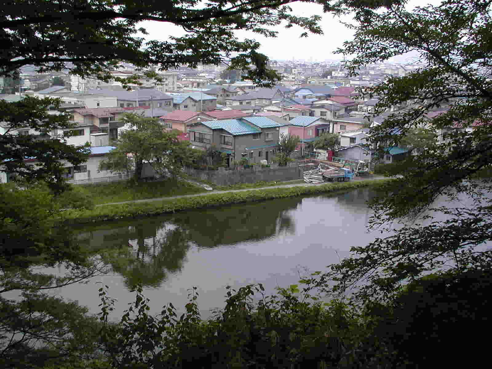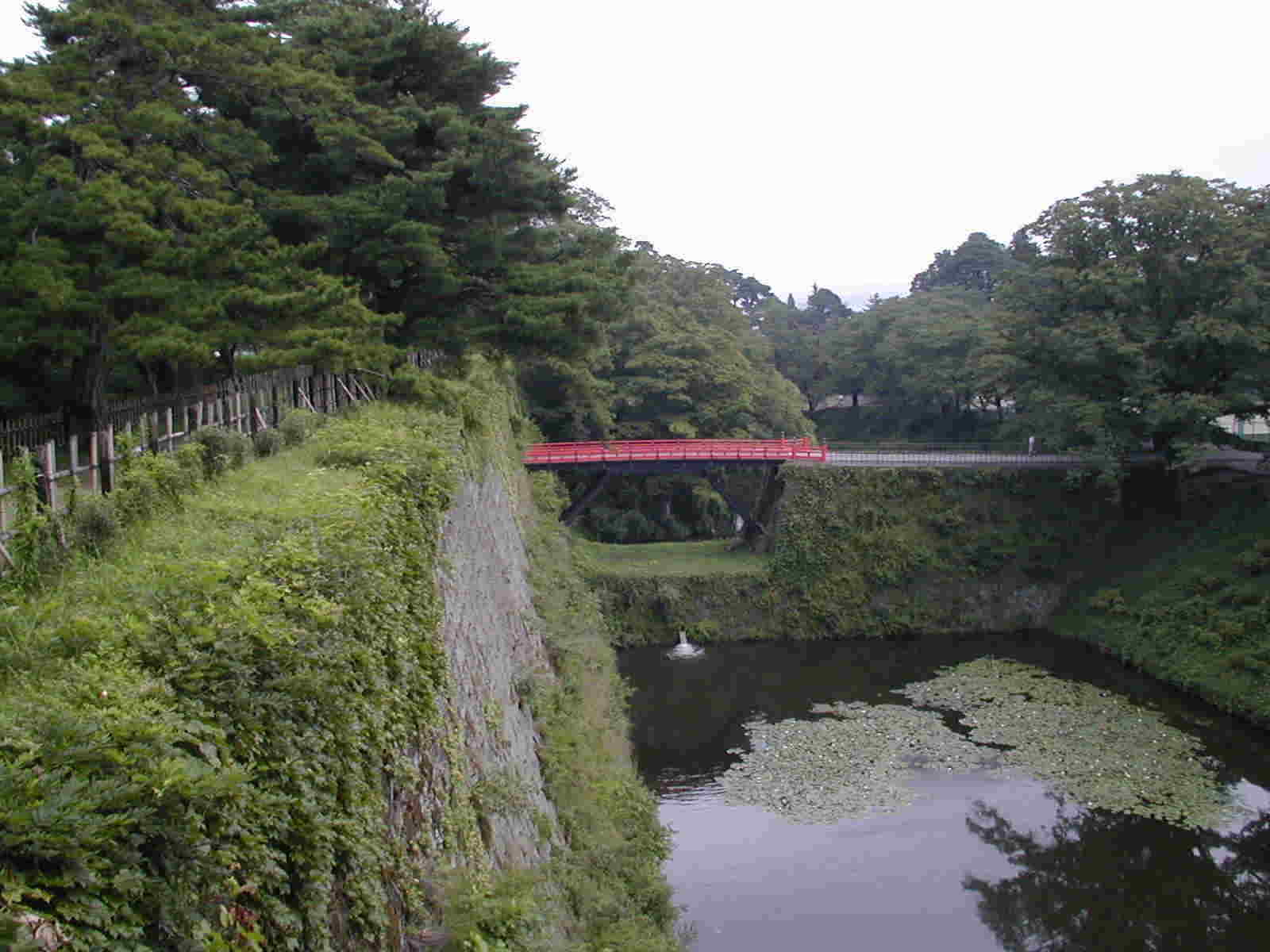 牛沼(本丸南の濠) 芦名時代ここの牛沼(現在は濠)を要害 として城を築いたのが今の若松城の始 まりです。また唯一、南側は出丸などの 防御施設が無いため、弱点防備のため 「横矢がかり」が作られています。 |