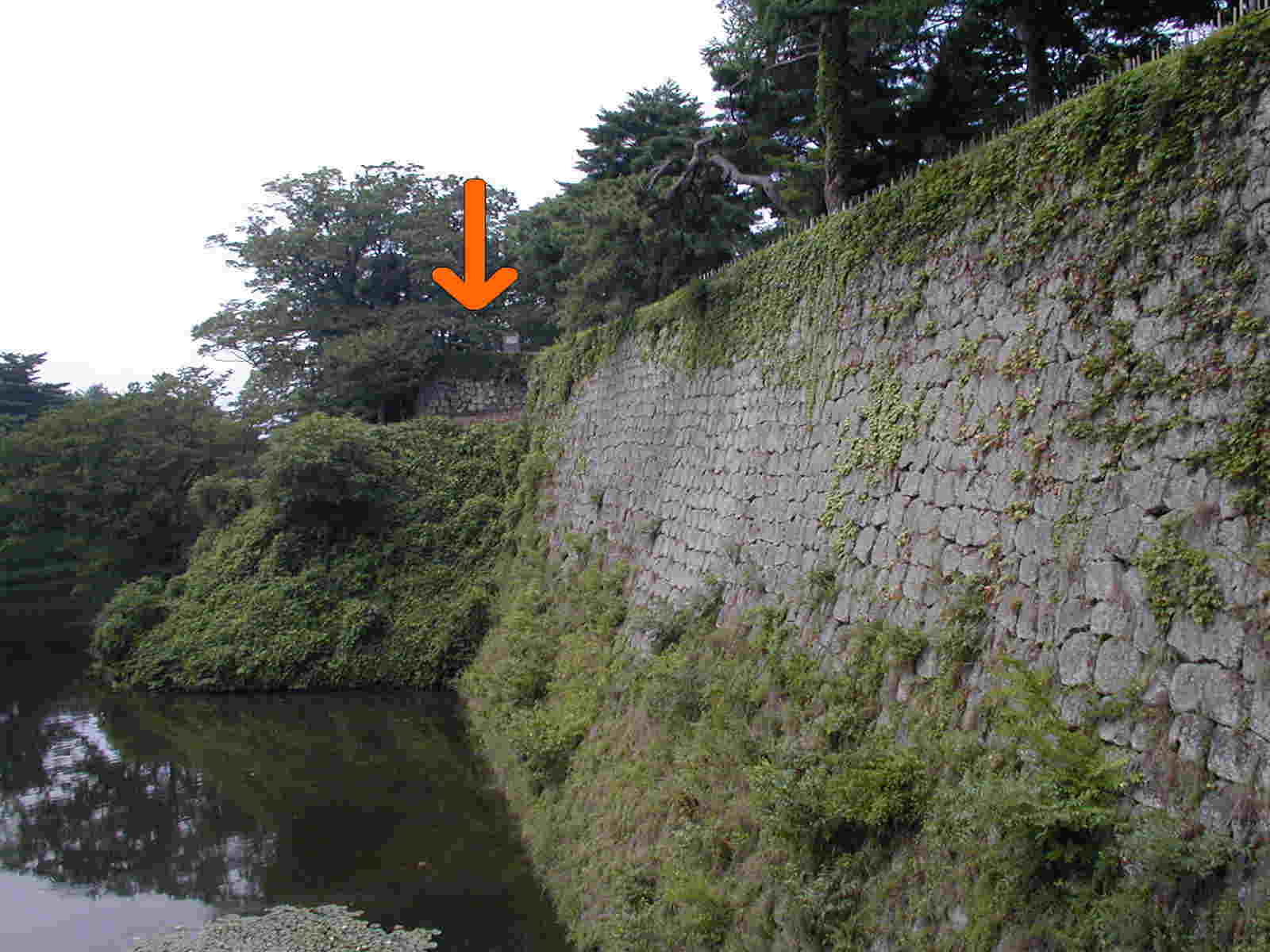 廊下橋より見た高石垣と茶壷櫓 矢印は上の写真を撮った茶壷櫓跡で す。この本丸東の石垣は城一番の規 模(高さ19メートル)を誇る美しい石 垣です。 |