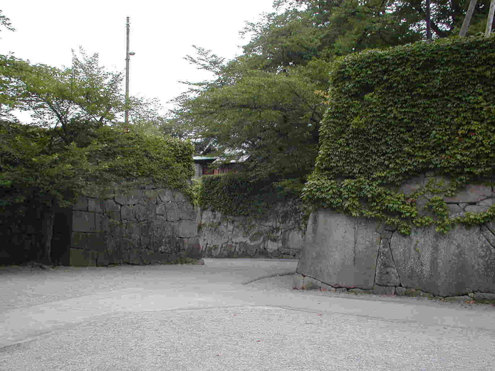 太鼓門跡(帯郭内より撮影) 北出丸から帯郭の入口にあたる枡形門 です。城の大手門にあたり、藩士の登城 を太鼓で知らせたそうです。 |