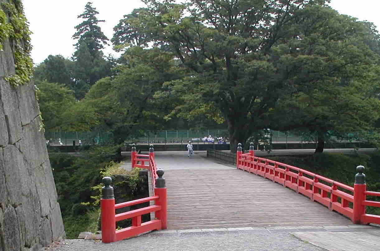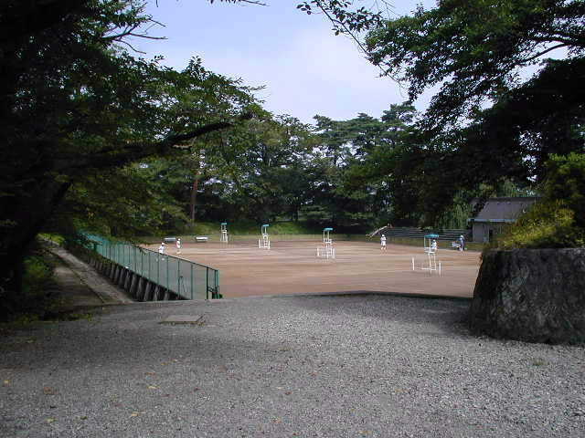 廊下橋門より見た二の丸内 現在はテニスコートになっています。 (城跡でテニスとはうらやましいです。) 藩政時代は米蔵がありました。 |