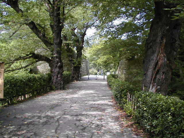 二の丸東門 東門は加藤嘉明の時代まで大手口に あたりました。(その後、主街道の変更 などで北出丸が大手口に) 見辛いかもしれませんが、門正面の石 垣が壊されていて枡形になっていませ ん。 |