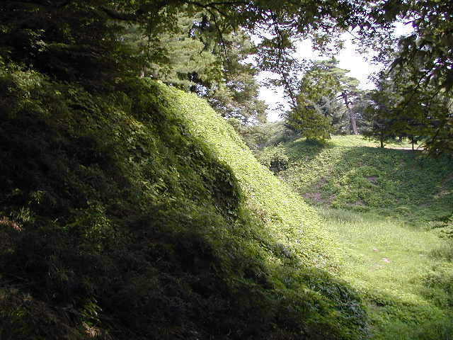 二の丸の土塁と濠 上記の門など以外は土塁です。 どうやら芦名氏時代の遺構の様です。 |
