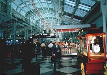朝7時にホテルをチェックアウトし、タクシーでSan Francisco空港へ。 10時の飛行機でSan Francisco空港を出発し、16時にChicagoのO'Hara国際空港に到着。 時差を含んでいるので、飛行時間は実質5時間くらい。それにしてもアメリカは広大である。 O'Hare(オヘアと読むらしい)は、ガイドブックによると「世界で最も忙しい空港」との事。 位置的にChicagoは米国のほぼ真ん中の大都市であり、国内移動時の乗り継ぎ主用ポイントと なっているようだ。各ターミナルは巨大なチューブ状になっており、端から端までは遠すぎて肉眼では見えない。 そこかしこにキレイなイルミネーションが施され、通路には軽食やおみやげの屋台がたくさ ん出ている。まるでショッピングモールのような雰囲気である。 ターミナル内にずっと甘ったるい匂いがしてて不思議に思っていたが、執拗なリサーチの結 果、ポップコーンの屋台のせいであることが判明する。(写真右を参照のこと) 記念にTシャツを買い、1時間ほどで再び機上のヒトに。2時間程でClevelandに到着する。 O'hara International Airport, Terminal-C