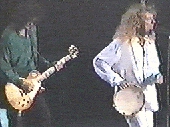 2日目にして、変則setlistのお出ましです。 この日はアメリカのT・S氏撮影のAudience ShotのVideoが広く出回っています。スタンド席 からの望遠撮影で、非常に安定した映像です。 私の所有する音源はこれまた某氏録音のUnderground Tapeです。適度に残響もあり、バランス の良いAudience録音です。 導入tapeもなく、いきなりBabe...でスタートです。珍しくオケ無しのシンプルな構成ですが、 その分オルガンが効果的に使われており、音の厚みは充分です。 RobertのVocalは序盤は若干苦しげですが、ステージが進む程に調子良くなっています。 この日の観客は初日に比べてかなりエキサイトしており、声援も大きめです。 たたみかけるように演奏されるBring It On Homeは上質のRock!サイドギターのつけ入るスキ は全く感じられません。 完璧なHeartbreakerの演奏に続いてThank You。これは全Tour中唯一の曲順ですが、反則とも 言える程のハマリ方です。Introにかぶせた"Good Evening, Tokyo!"のMCもニクイ演出です。 「我々は毎晩、少しずつ内容を変えて演奏するように試みています」 と宣言し、Gallows Poleを演奏します。この位置では通常No Quarterが演奏されており、cut されたのは初の出来事です。途中から入るDrumsのド派手な叩き方には、ちょっとビックリさせ られます。 Hurdy Gurdy Soloの後にNobody's Fault But Mine、というのは、6/7/95のLyon公演以来と いう懐かしいパターンです。 「今のは1929年の作品で、John Paul....じゃなくってBlind Willie Johnsonの曲です」 というRobertのちっさいボケに、意外なほど観客は笑っています。 「あ、君たち、バラエティー・ショーが見たかったんだね?」という次のセリフは、 『こういうベタなギャグなら、英語の不得意な日本の観客にも通じるんだ!』という安堵から 来たものではないでしょうか? SIBLYのIntroは重々しい感じのフレーズ回しです。Vocalのバックでは、Tea For Oneのフレー ズを一発入れています。Soloもあくまで重厚!といった感じで、完璧なバックの演奏とあいま って素晴らしい曲に仕上がっています。 通常、この曲の後はメンバー紹介をしてTSRTSを演奏するのですが、この日は続けてEgyptians を紹介し、意外にもDancing Daysを演奏しています。(結局TSRTSは演奏されない!) 一糸乱れぬ迫力ある演奏であり、この曲の良さを十二分に発揮しています。 以降、Yallah/Four Sticks/In The Evening/KashmirとEgyptian合体曲を5曲も続けること により、ボルテージを徐々に盛り上げながら壮大なるエンディングを迎えることができました。 この日のEncoreも非常にレアなパターンです。 二人っきりのTangerineは2nd-LegのBoston公演以来ですが、アンコールでの演奏はお初です。 間奏でのJimmyのカッティングはややラフな印象です。 2曲めはネブワースVersionのWLLです。アンコールでの演奏はEuroのToulouse公演以来ですが、 Thereminやメドレーまでキッチり演るのはこれまた初めてです。メドレー曲のIn The Lightも 実はUS 2nd-LegのIrvine初日以来であり、久々の登場でした。"You need Love"部の雄叫びが 鳥肌ものの迫力です。 長いOvationの後、なんと2nd Encoreに再登場!曲はお馴染みRock and Rollです。 Robertは初日より明らかに伸びやかなVocalでガンガン攻めたてます。Soloはワウをかけて おり、非常にスリリングなフレーズ回しです。エンディング近くのHardな音色もキテます。 "Lonely, Lonely"のところを観客とかけ合い、最高の演奏が幕を閉じました。 PLAY : 5.0 REC : 5.0 (1st Gen. from Remasterd Original Source) RARE : 1.0 [Boot CD: Unledded Live 1996, The 2nd Day, No Quarter 他](Eastern)/Celebration Day/Bring It On Home/Heartbreaker/What Is and What Should Never Be/The Rain Song/Hurdy Gurdy Solo/When the Levee Breaks/Gallows Pole/Tea For One/The Song Remains the Same/Babe, I'm Gonna Leave You/Whole Lotta Love-Down By the Seaside-Break on Through-Dazed and Confused/Yallah(failed)/Four Sticks/In The Evening-Carouselambra/Kashmir//Custard Pie-Black Dog/Rock and Roll