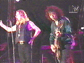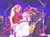 "Hollywood Rock Festival"はSao Pauloで1/19,20,21の3日間、Rioで1/26,27,28の3日間 開催されました。我がPage/Plantはどちらの土地でも1公演ずつ出演しています。 さて、この日はFestivalの2日目です。会場は野外サッカー場で、観客は約48,000人。 あいにくの雨の中、19:00からBrazilian Bandの演奏が始まり、2番手がUrge Overkill。 3番手のBlack Crowesのステージが終わったのが22:00過ぎで、トリのPage/Plantのステージ が始まったのはなんと23:00近くでした。 この日のVideoには、MTVでオンエアされたPro-ShotとAudience-Shotがあります。 前者はGallows/Heartbreaker/WLL/R&R/Black Dog/Kashmirの6曲の断片的な収録で、二人の 記者会見の他、Hossam Ramzy & Egyptiansへのインタビューが挿入されています。レポートは 全てPortugal語であり、おそらくはBrazilでのLocal放送と思われます。 現時点ではこの日のAudio Tapeは一切出回っていないため、ほぼcompleteである後者のVideoを もとに記述します。 鉄パイプをモダンにあしらった巨大なステージで、左右のVideoスクリーンの上にFestivalの マスコットと思われる"Rocker"っぽい男のオブジェが飾られています。ステージ後方にはカシ ミール模様の緞帳もしっかりかけられており、完全にメインの扱いであったと思われます。 Jimmyはいつもの緑のサテンシャツ、Robertは黒の袖なしベスト姿です。 Robertは振り絞る感じの声で絶好調ではないですが、その分迫力はあります。Jimmyは飄々と した感じで体調は良さそうですが、1曲目のWantonでは中盤のリフがちょっと怪しげです。 2曲目のBring It On Homeは今まではメインのリフをPorl Thompsonと二人で弾いていましたが、 今日からはひとり!別段音の薄さは感じられなく、まずは一安心です。 間髪入れずにHeartbreaker、という構成はUS 2nd-Leg終盤と同様です。 Ramble Onの演奏後、Robertが女性の通訳付きで観客に語りかけます。そして、Jimmyの紹介後、 なんとJimmyはマイクを手にし、なにやらゴニョゴニョとご挨拶!おそらく全Tour中でもJimmy がステージでしゃべったのはこの日だけではないでしょうか? Gallow PoleではKeyboardのEd Shurmurがバンジョーを弾いています。 SIBLYは二人とも大熱演。TSRTSはPorlのサポート無しが懸念されましたが、全然問題なしです。 Going To Californiaでは、Hurdy Gurdy奏者のNigel EatonがOvationのMandlinを演奏しま した。WLLは通常のリフから始まり、中盤に変則リフが入るネブワースVersionです。この日は メドレーでCustard Pieを2コーラスほど演奏しています。珍しくBreak on Throughはなし。 Four Sticksの前、Robertは再び女性通訳をステージに呼び、Egyptiansを紹介しています。 In The Eveningでは珍しくリュート(西洋琵琶?)奏者が参加しており、前奏/間奏で不思議 なフレーズをかましてくれてます。 EncoreのBlack Dogでは観客総立ち/総飛び跳ね状態!かつてこれほど観客に熱狂的に受け入れ られた公演があったでしょうか?Jimmyが休みの度にBrazilに行くのも分かる気がします。 この日は2nd encoreに登場し、Rock and Rollを演奏してます。Soloは終わりがちょっと違う 1975年Versionで、更に珍しくWahを踏んでいました。 Festivalとは言いながら約120分のフルステージ!イベント一杯で聴き応え充分の初日でした。 PLAY : 4.5 REC : 2.0 (Underground Video) RARE : 5.0 [Boot CD: Not Released](Eastern)/Immigrant Song-The Wanton Song/Bring It On Home/Heartbreaker/Thank You/No Quarter/Hurdy Gurdy solo/Gallows Pole/Since I've Been Loving You/The Song Remains the Same/Going to California/Babe I'm Gonna Leave You/Whole Lotta Love-Light My Fire-Break On Through-Dazed and Confused/Four Sticks/In the Evening-Carouselambra//Black Dog/Kashmir//Rock and Roll