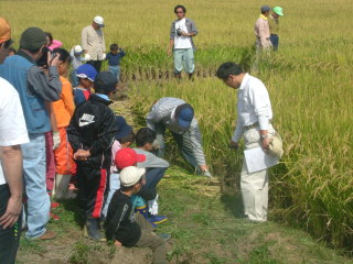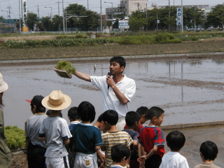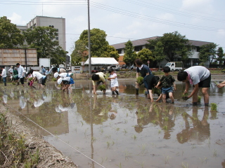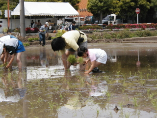 | 石川均会員による植え方の技術指導(写真右)の後、1反2瀬の田んぼに苗を植えました。 みんな一生懸命田植えをして、約1時間ほどで終了。 秋にはおいしいお米がたくさん獲れますように・・・。 |