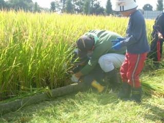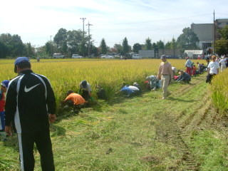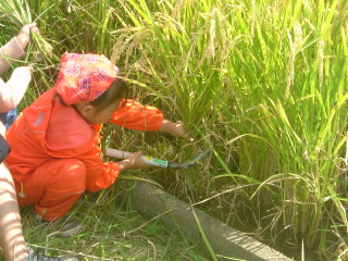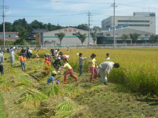 | みんなで並んで一斉に稲刈り開始! 持ち慣れないカマにヒヤヒヤ… 手を切らないように気をつけて! 無事稲刈り終了です。 さて、お味のほうはいかがかな? |