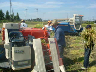 | 10月5日(日) 実りの秋、彩の町騎西稲作学校でも収穫の時期となりました。 今日は待ちに待った稲刈りです。 関口智会員による稲刈りの技術指導の様子です。 |