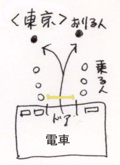 東京では人々は、降りる人優先で、きちんと並んで待ってます。