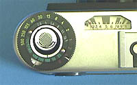 写真左の矢印のついているツマミがシャッターダイアルです。巻き上げないとシャッターをセットしないと何処をさしているのかわからない。