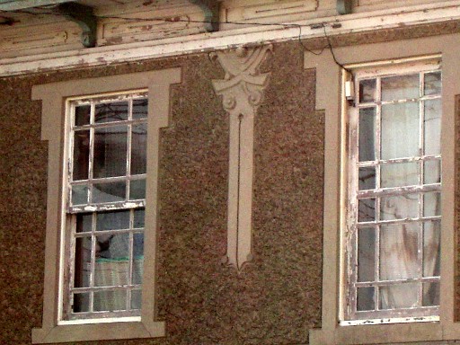 二階には三つの窓がある。白い木枠の塗装は傷みが目立つが、ちっとも気にならない。窓の間の壁の装飾、軒の支えも美しい。不思議なもので、最近の建物は傷みはじめるとどうしようもなく醜くなってしまうが、古い建造物は古ければ古いなりに美しい。