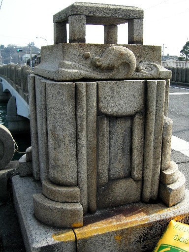ゆるやかなアーチ型の橋は昭和十三年架橋と読める。波をかたどった飾りは、ここが海辺の町だからだろうか。橋の下は川ではなく海水の入る運河のようだ。レジャーボートが何艘か係留してあるが、岸壁の大きな鉄輪からすると、かつてはもっと大きな船が出入りしていたようだ。