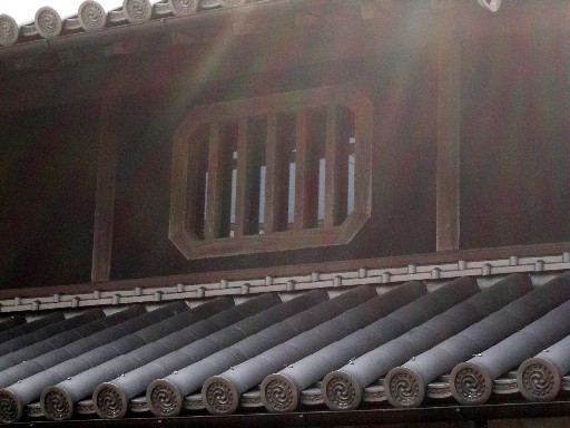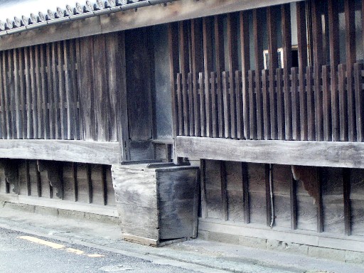 しばらく行くと、太い格子窓の町家があった。どっしりとした直線が美しいが、もちろん実用的なものだ。おそらくは財産を守るために必要だったのだろう。黒い壁の中二階の窓は八角形に縁取られている。太い木枠と格子が漆喰の黒とよく調和している。内側のガラスは近年にしつらえたものだろう。もとは白い障子だったかもしれない。