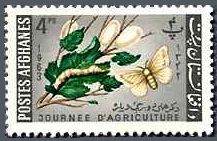 このアフガニスタンから1963年にカイコを描いた農業の日切手4種が発行されました。図案は一種類で、色違いの4種です。