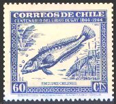 1948年にチリで発行された、チリの動物と植物とに関するゲイの著書出版100年記念切手25種の中に、哺乳類6種、鳥類5種、爬虫類1種、魚類3種が描かれています。単色刷で、同じ図案のものが3色あり、60¢は青、2$は緑、3$は赤で印刷されています。