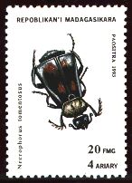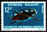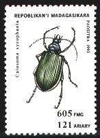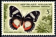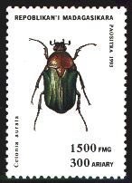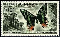 マダガスカルの昆虫切手マダガスカルはアフリカ大陸から離れた島国であることから、猿などの哺乳類をはじめ動物の生態系に特異なものが多く特産の昆虫も多く見られます。