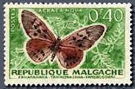 このアフリカの南東に浮かぶ大きな島国マダガスカルから1960年に美しい凹版多色刷りの蝶切手8種が発行されました。