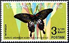 タイの昆虫切手タイは、インドシナ半島の中央部に位置し、東南アジア地域で唯一、欧州列強の植民地支配を免れた国です。元首に国王を頂く王制国家で、13世紀のスコタイ王朝、14世紀のアユタヤ王朝を経て、1782年にチャクリ王朝が創設され、1932年には正式に立憲君主国家となり、現在に至っています。国名はかってはシャム(SIAM)でしたが、1949年にタイ語で「自由な国」を意味するタイ(Thailand)に改められました。この名称は東南アジア諸国が欧州列強の植民地となる中でタイが独立を保ったことを示しています。