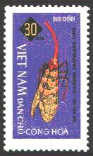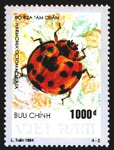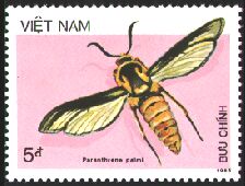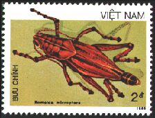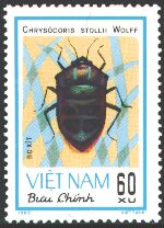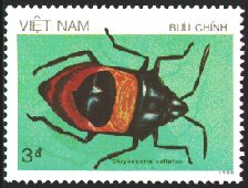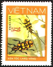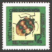 その後、南・北ベトナムが統一されベトナムが誕生、そのベトナムから1977年にカミキリムシを描いた甲虫切手8種が発行されました。さらに、1982年にカメムシを描いた切手8種が発行されました。8種類のすべてがカメムシで統一された美しく珍しい切手です。1986年にも昆虫切手8種が発行されました。1993年には、各種のミツバチを描いた切手6種が発行されました。その後、1994年、1996年に甲虫切手が各々4種、6種発行されました。