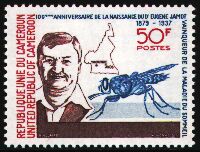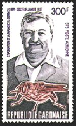 ジャモ・バンクエール(1879-1937)は、眠り病の研究家で、切手にはその病原体であるトリパノゾーマを媒体させるツェツェバエ(Glossina palpalis)が描かれています。
