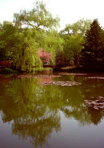 旧道庁前の池に映る枝垂れ柳と八重桜
