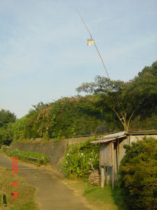 ←竿の先にあるのはブリキ缶 農家の人が紐を引っ張るとガラガラ!という大きな音が。 でも恐れおののいて一目散に逃げ出すのはタクちゃんだけで、肝心のスズメたちは、へいっちゃら! |