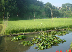 水田の間をカルガモが泳いでたり、2回ほどグレーの鶴のようなアオサギの美しい姿も見ました。睡蓮もきれい。タニシがたくさん。それに、よ〜く目を凝らすと、亀も・・・。![]() |