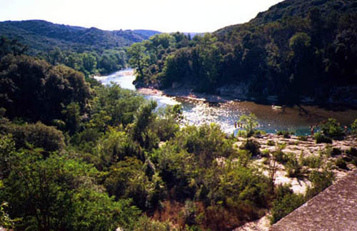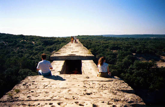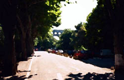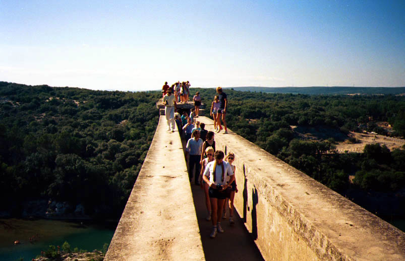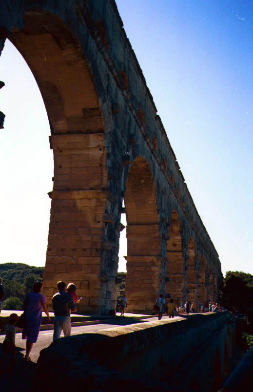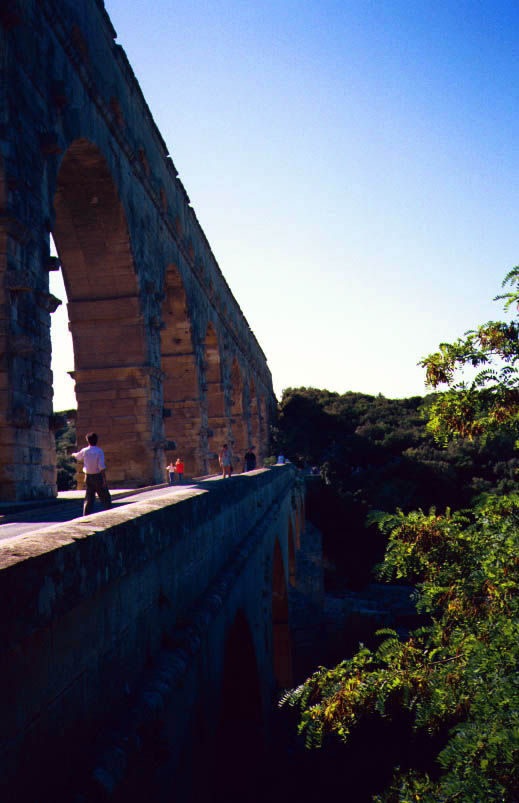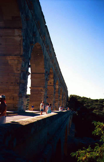 du Gard行きのバス停はちょっとわかりにくい所にあるので注意。Avignonの駅前のバス停なのでさがしてください。とにかくすごい。 2,000年も前に50km先の町まで微妙な傾斜をつけて水を流したのですから、ロ−マ人の技術には恐れ入ります。Pont du Gardの上は歩けるようになっています。私の行った日は風が大変強く、その上、両手、背中とも荷物でいっぱいだったので、途中で戻ってしまいました。橋の下の川は夏は舟遊びを