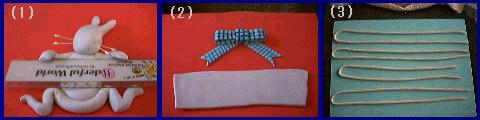 (3) 細いひもを4本作り,つまようじや専用の道具で「すじ」をいれます。