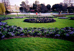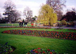 パームハウスの前の池 柳の芽吹きが金色できれいです。 |