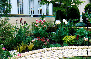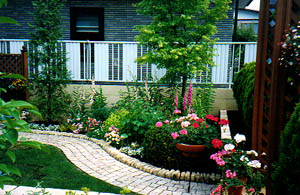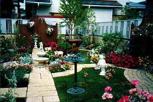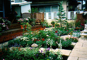 大村さんのお宅は会員の方に公開をされました。大村さんのお庭は昨年完成したばかりです。イギリス産の石を使ったフォーマルなお庭。ご主人が丹精をこめて管理している庭は植物がとても元気です。花木・宿根草・バラなどを植えた60坪の広さのお庭です。