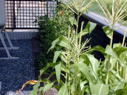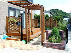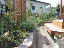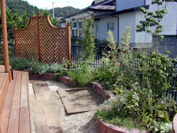 片山さんは2000年に家を新築なさった際に庭の相談を受けました。まだまだ子育てに手がかかるのでなるべく草取りや手入れなどの手間をかけないように楽しめるような構成を考えました。屋根をつけたデッキは子供の遊び場にそして家から庭をつなぐ空間としてとても好評でした。メインの庭の脇にはキッチンガーデンのコーナーもあります。施工は西舘拓硝子店さんにおねがいしました。