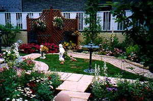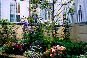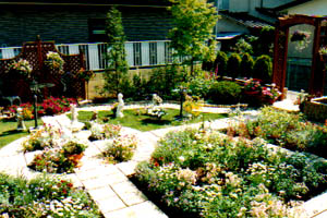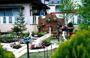 大村さんは庭をリフォームしました。地元のエクステリア業者の西舘拓硝子店さんが施工したイギリスの石を使ったオシャレなガーデンです。庭つくりを退職後のライフワークにというご主人のお手伝いをして植栽をお手伝いしました。通路で区切られた植栽スペースをテーマごとの色分けをし植物を決めていきました。またデッキの前は左右対称のフォーマルな構成を生かし、中心にうえたバラとキャットミントでイメージとしてはヘスタクームガーデンのような庭にと植栽を考えました。この時点では植物がまだ茂っていませんが土作りを一生懸命にがんばったご主人の努力の甲斐があって植物達はビックリするほどよく茂ってくれました。2001年にはは本場のガーデニングを見学にニュージーランドへ行くそうです。これから自分なりに庭をアレンジされていくことでしょう。