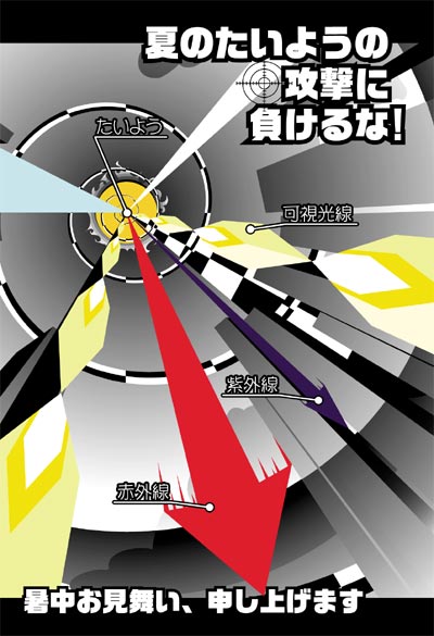 ●暑中見舞い!(イラレのみ。2003,7) 学校の課題で、暑中見舞いの図案を考えるということで。コンセプトは・・・ あつ〜〜〜い夏。暑くて暑くて、なんでこんなにに暑いんだよ!と思った。 それは、太陽が僕を攻撃するからだ。 太陽から、可視光線と、紫外線と、赤外線で 攻撃してきているからだ! 畜生、そんなもんに負けるな! みんな負けないでガンバレ! そういうイメージで。 電波デスカ? この図案にも、学校で習った一点透視の技法をつかいました。そこに曲面とかなんとか絡ませてみようとかやったんですけど、イマイチ意味をなしてない気がしますねー。螺旋はイラレのデフォルト機能だし・・・ 空を見上げている構図をイメージしているんで、雲とかビルとか入れてみました。一点透視って、遠近感の表現に使うとこうなるのでしょうね。なんだか魚眼レンズっぽいですが。 空とか建物とか、ちゃんと描き込んで色も明るくカワイくつけようか・・・迷ったんですが。一応太陽光線が主役ということで、安直(コラ)にもモノクロのグラデを。 |